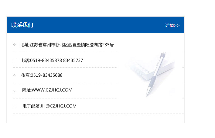 地址:常州市新北區友邦商務大廈1幢16、17層  電話:0519-85101652  傳真:0519-85112595  郵編:213022  網址:www.cz-jiayue_cn.zigonghongshun.com  郵箱:xiajifengaa@163.com